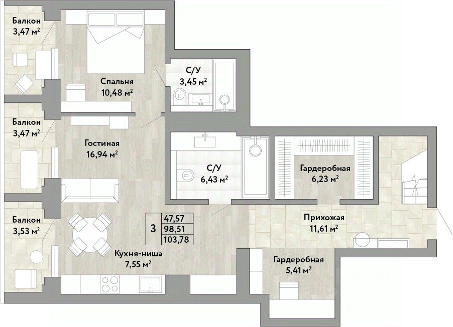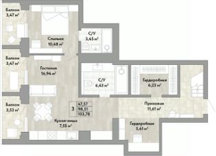 Просторная трехкомнатная квартира с предчистовой отделкой в ЖК "Stories" на 1 этаже. Общая площадь: 98.51 кв.м. Высота потолков 2.9 м.