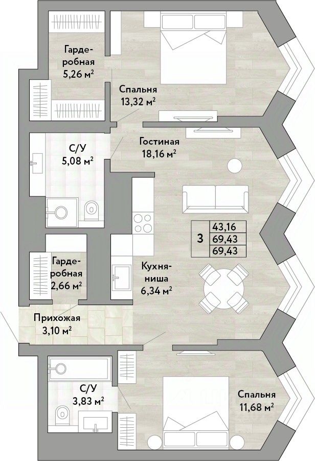 Трехкомнатная квартира с европланировкой и предчистовой отделкой в ЖК "Stories" на 22 этаже. Общая площадь: 69.43 кв.м., жилая: 43.16 кв.м., общая площадь гостиной-столовой с кухонной зоной: 24.5 кв.м. Европланировка, за счет большой площади кухни-гостиной квартира выглядит просторной и очень удобна для жизни. Комнаты изолированные, все окна выходят на одну сторону. В квартире два совмещенных санузла. Высота потолков 2.9 м.