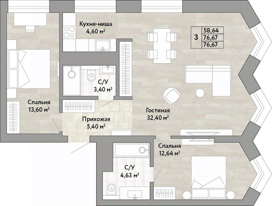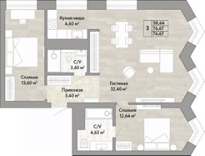 3-комн. квартира от застройщика с предчистовой отделкой в ЖК "Stories" на 22 этаже. Общая площадь: 76.67 кв.м. Высота потолков 2.9 м.