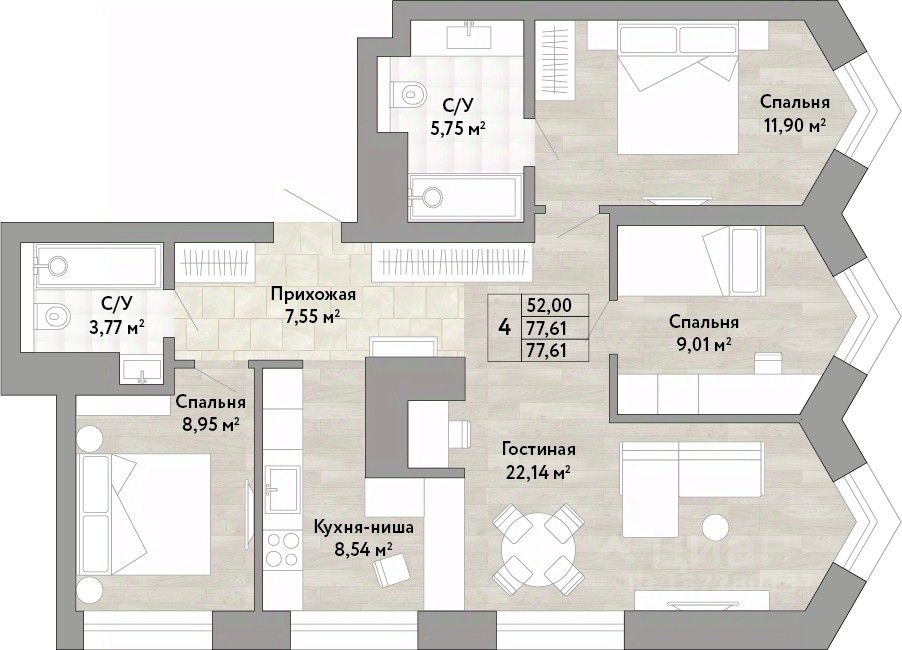 Просторная четырехкомнатная квартира с европланировкой и предчистовой отделкой в ЖК "Stories" на 19 этаже. Общая площадь: 77.61 кв.м., жилая: 52 кв.м., суммарная площадь гостиной-столовой с кухонной зоной: 30.68 кв.м. Европейская планировка, кухня и гостиная объединены в одно просторное помещение. Угловая квартира, окна oбecпeчивaют paвнoмepнoe ocвeщeниe в тeчeниe дня. В квартире два совмещенных санузла. Высота потолков 2.9 м.