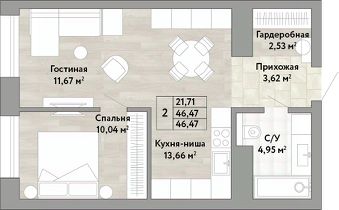 2-комн. квартира с европланировкой и предчистовой отделкой в ЖК "Stories" на 8 этаже. Общая площадь: 46.47 кв.м., жилая: 21.71 кв.м., общая площадь гостиной-столовой с кухонной зоной: 25.33 кв.м. Европланировка, кухня-гостиная - идеальный вариант для тех, кто любит часто принимать гостей. Комнаты изолированные, все окна выходят на одну сторону. В квартире один совмещенный санузел. Высота потолков 2.9 м.