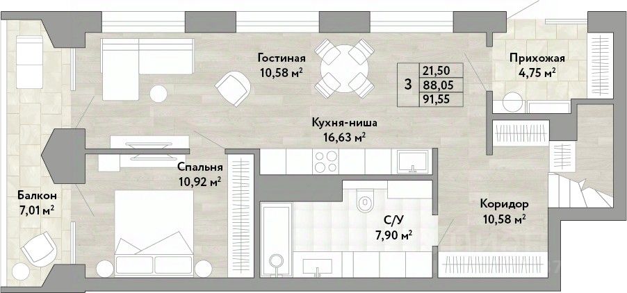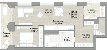 Продается 3-комн. квартира с предчистовой отделкой в ЖК "Stories" на 1 этаже. Общая площадь: 88.05 кв.м. Высота потолков 2.9 м.