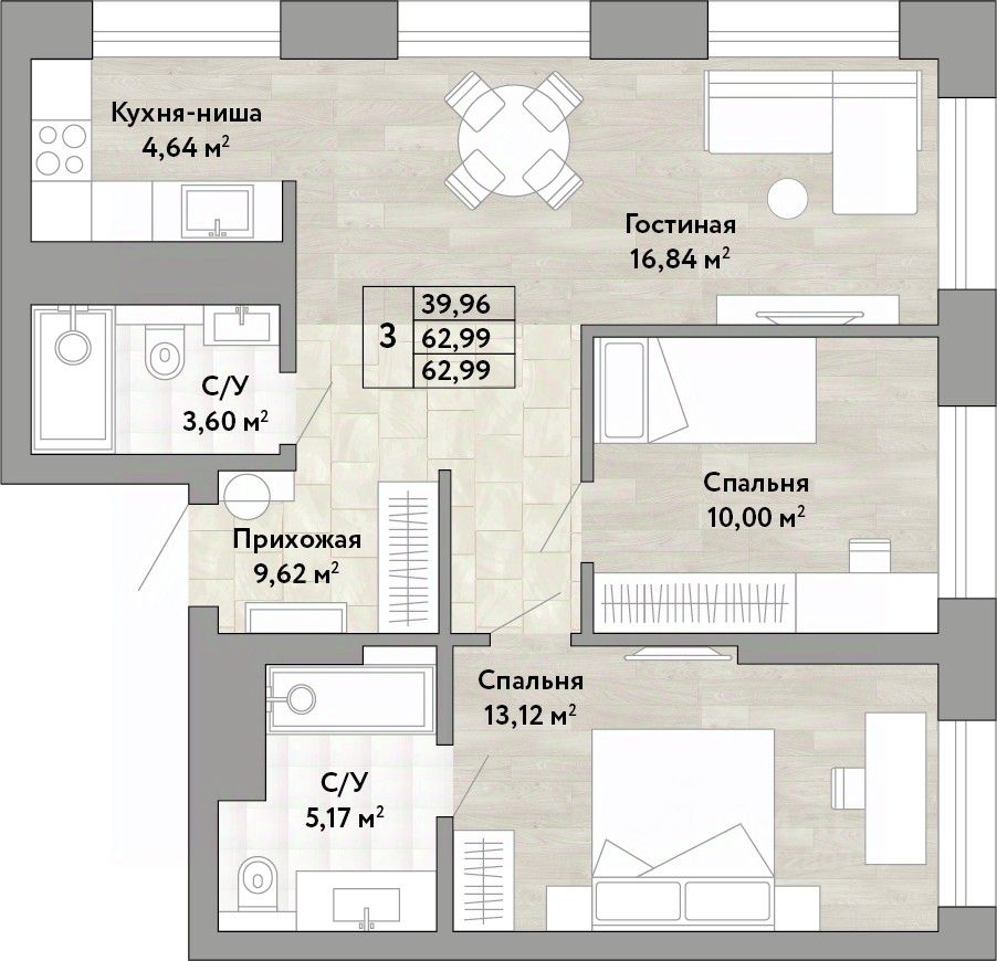 3-комн. квартира с европланировкой и предчистовой отделкой в ЖК "Stories" на 12 этаже. Общая площадь: 62.99 кв.м., жилая: 39.96 кв.м., суммарная площадь гостиной-столовой с кухонной зоной: 21.48 кв.м. Европланировка, за счет большой площади кухни-гостиной квартира выглядит просторной и очень удобна для жизни. Угловая квартира, идеально подойдет любителям тишины и панорамных видов. В квартире два совмещенных санузла. Высота потолков 2.9 м.