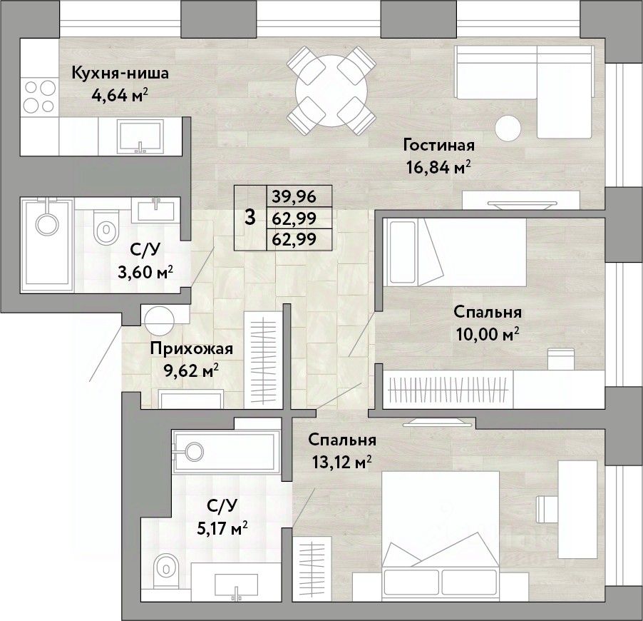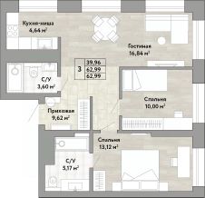 3-комн. квартира с европланировкой и предчистовой отделкой в ЖК "Stories" на 13 этаже. Общая площадь: 62.99 кв.м., жилая: 39.96 кв.м., общая площадь гостиной-столовой с кухонной зоной: 21.48 кв.м. Европейская планировка, за счет большой площади кухни-гостиной квартира выглядит просторной и очень удобна для жизни. Квартира угловая, очень светлая, естественная вентиляция при открытии окон. В квартире два совмещенных санузла. Высота потолков 2.9 м.