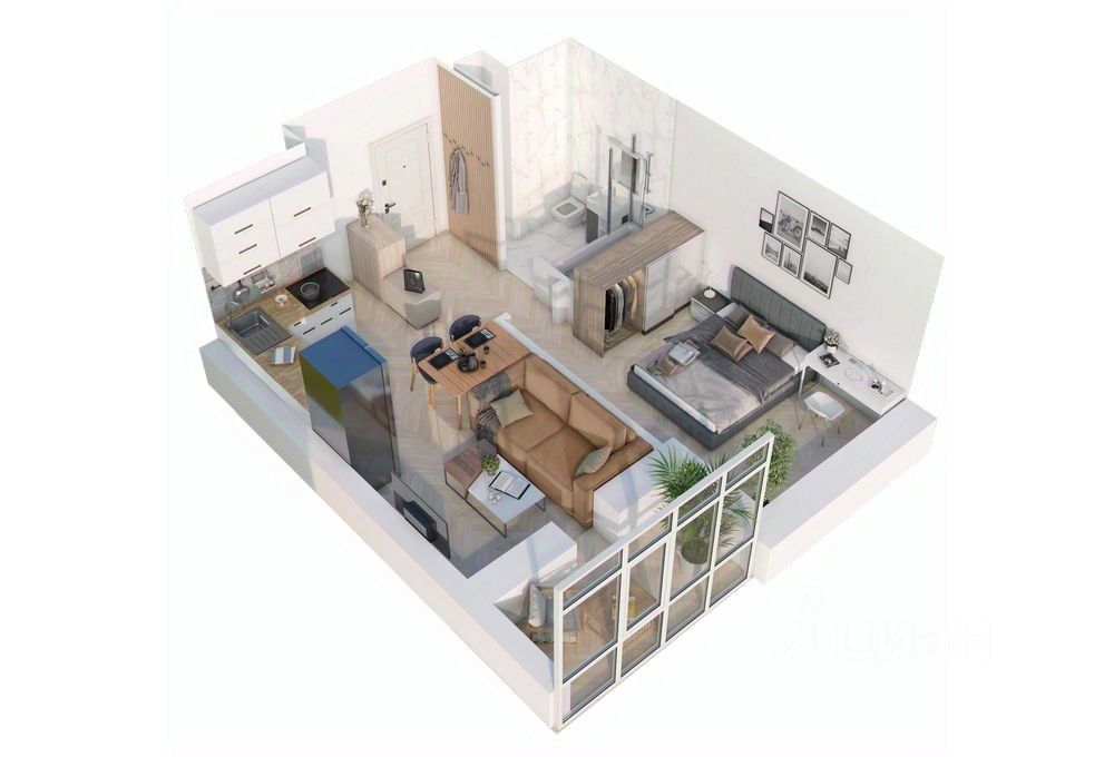Просторная светлая 1-комнaтная кваpтира с большой кухней-гостиной и комфортным санузлом. Есть места для хранения. Лоджия с панорамным остеклением как персональная зона отдыха или работы.