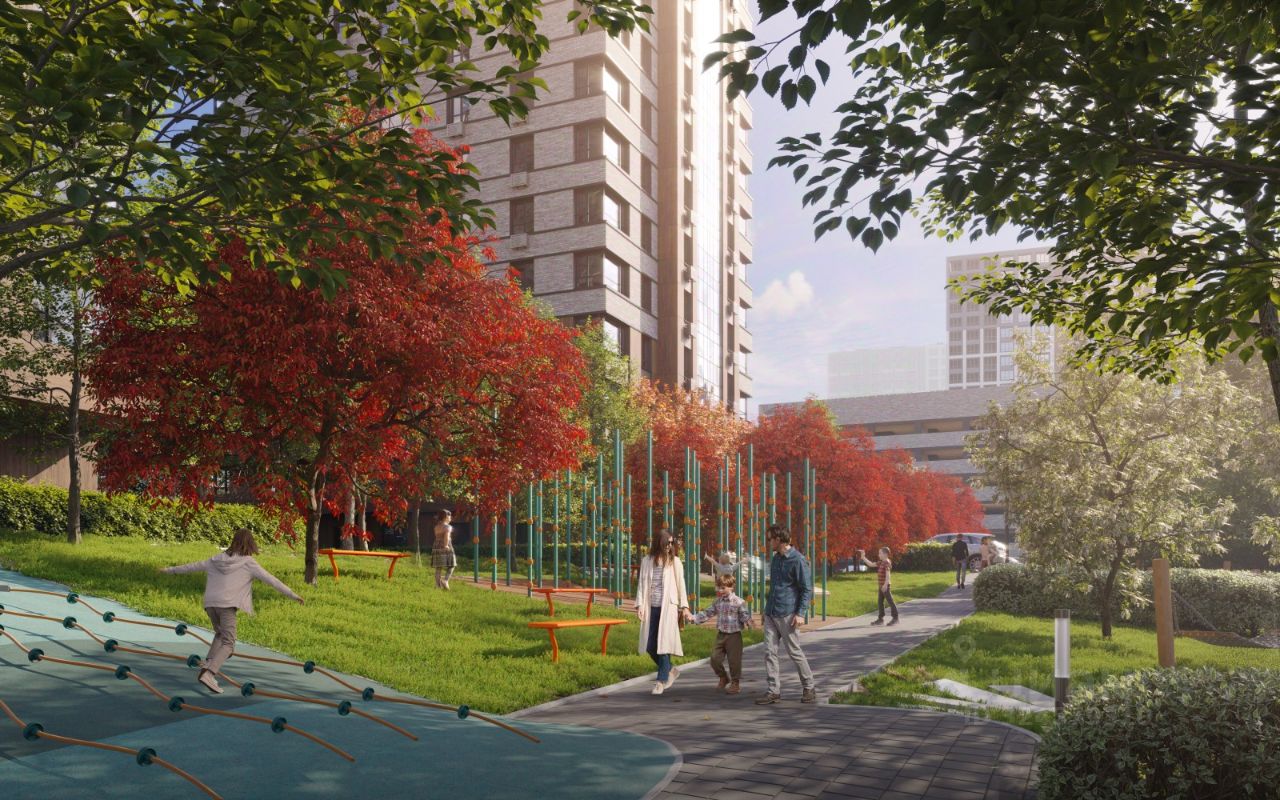 Дети постарше лазают по современному игровому комплексу или катаются на памп-треке — отвлекаясь от гаджетов и не выходя за территорию ЖК.