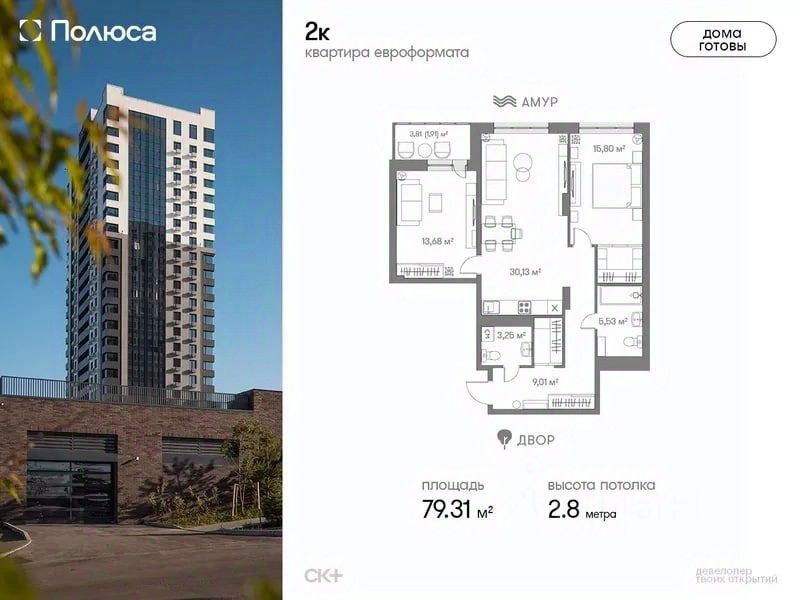Площадь — 79,31 кв. метра, светлая просторная квартира евроформата с окнами на Амур. Большая лоджия с возможностью утепления и расширения зоны жилой комнаты, где можно сделать рабочее место или детский уголок для творчества и игр.