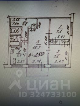 Общая площадь квартиры 47.3 кв.м.; жилая 30.9 кв.м.; кухня 5.6 кв.м.; комнаты 7.6 кв.м., 7.6 кв.м и 15.7 кв.м.; санузел смежный; высота потолков 2.5 м.