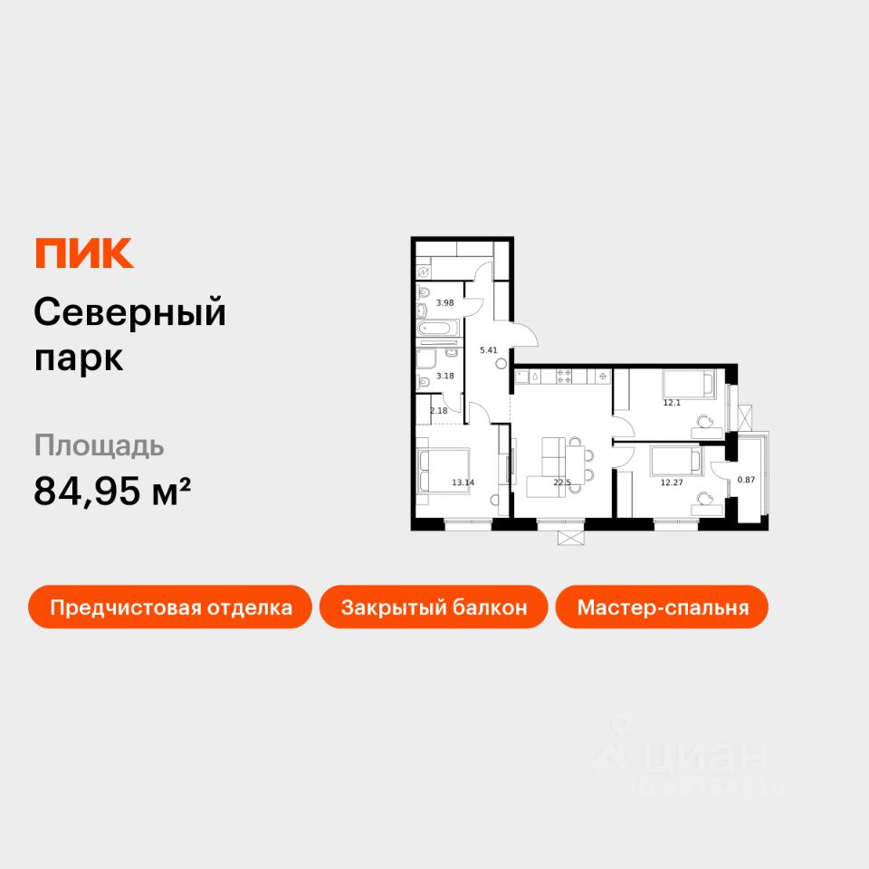 Продаётся 3-комн. квартира площадью 84,95 кв.м на 5 этаже 10 этажного дома (Корпус 8, Секция 1) проекта ПИК Северный парк. Светлый просторный подъезд на уровне земли, функциональная планировка, большие окна, предчистовая отделка.