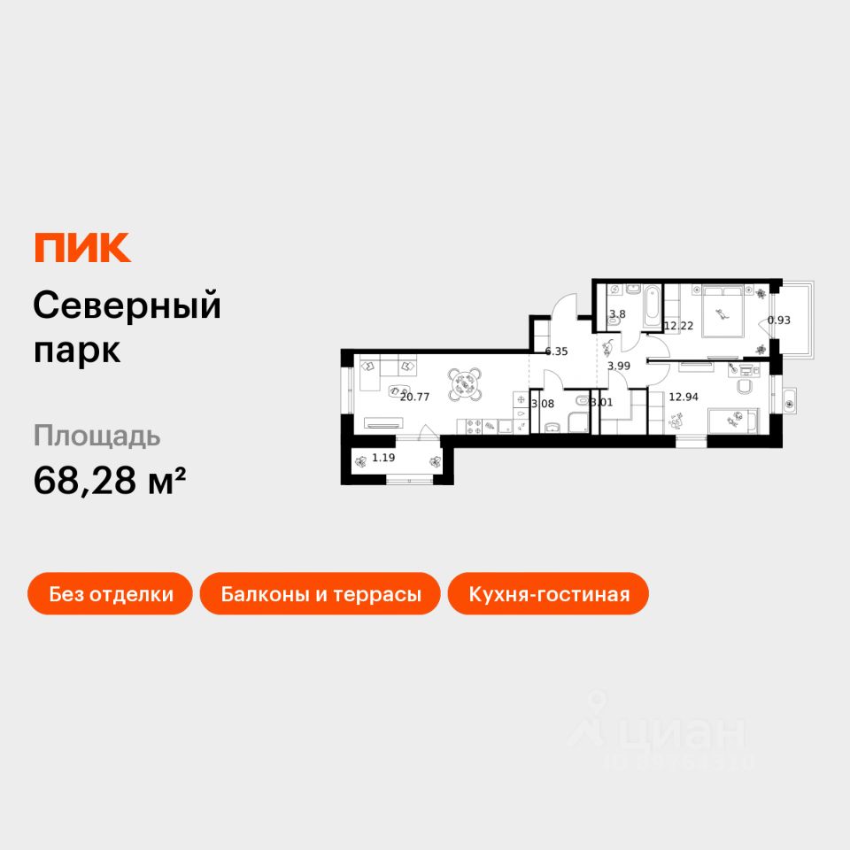 Продаётся 2-комн. квартира площадью 68,28 кв.м на 10 этаже 10 этажного дома (Корпус 11, Секция 2) проекта ПИК Северный парк. Светлый просторный подъезд на уровне земли, функциональная планировка, большие окна, без отделки.