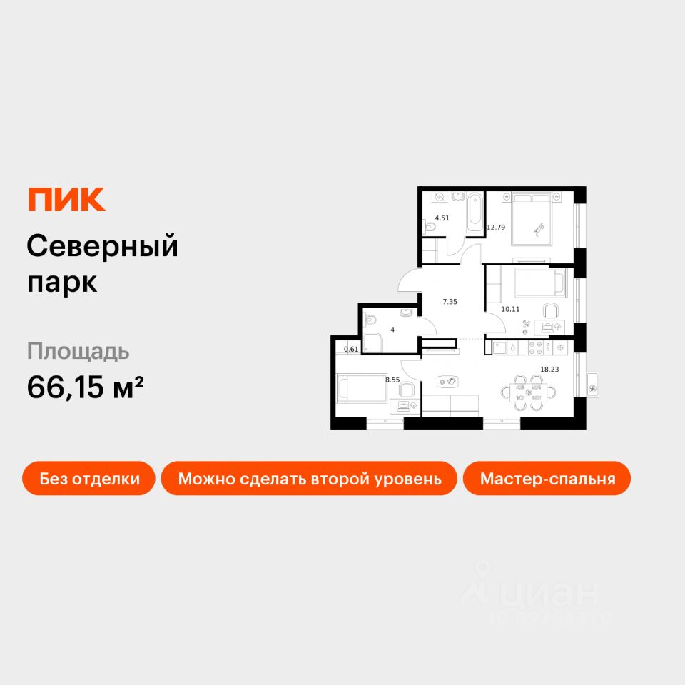 Продаётся 3-комн. квартира площадью 66,15 кв.м на 9 этаже 10 этажного дома (Корпус 11, Секция 3) проекта ПИК Северный парк. Светлый просторный подъезд на уровне земли, функциональная планировка, большие окна, без отделки.