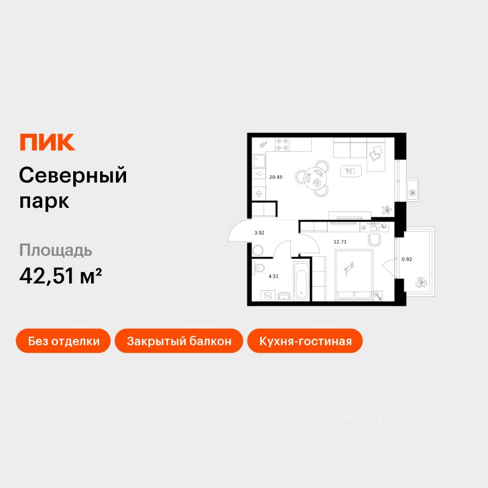 Продаётся 1-комн. квартира площадью 42,51 кв.м на 6 этаже 10 этажного дома (Корпус 11, Секция 1) проекта ПИК Северный парк. Светлый просторный подъезд на уровне земли, функциональная планировка, большие окна, без отделки.