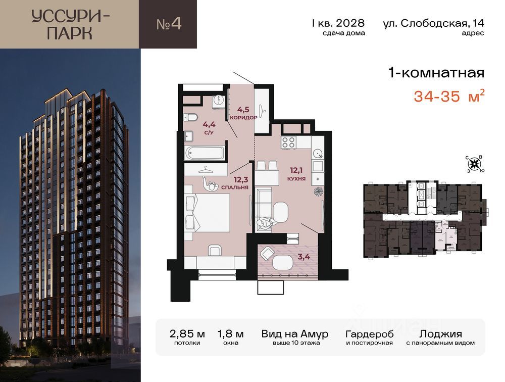 СТАРТ ПРОДАЖ р-н пл. Блюхера - тихий центр города. Уссурийский бульвар, школы, детские сады в 10 мин пешком. Планируемая сдача дома - 1 квартал 2028 года. Рассрочка 0% на первый взнос до 1 года без увеличения стоимости квартиры Выгода до 2,5 млн на старте продаж До конца ноября скидка 2% для участников СВО, медицинских работников, учителей, работников ОПК Просторная светлая 1-комнaтная кваpтира 36-41 м². Здесь спальня, кухня-гостиная, большой санузел, а также лоджия, которую можно оборудовать как зону отдыха или кабинет. Высокие потолки 2,85 - 3,30 м от стяжки пола, большие окна до 1,8 м и панорамные виды с лоджии - все это дает максимум света, легкости и свободного пространства. После 10 этажа открывается вид на Амур и потрясающие хабаровские закаты О ЖК: Архитектурная доминанта района. Концепция от известного архитектурного бюро PERGAEV BURO Высокие потолки 2,85-3,30 м и большие окна до 1,8 м Приватная территория под видеонаблюдением. Детская площадка, воркаут, гриль-зона, зона отдыха и догхаб с выгулом Дизайнерские холл и отделка в подъезде На первом этаже клубная гостиная для соседей, колясочная, лобби с мягкими зонами, гостевой санузел Подземный паркинг с лифтом от квартиры до машины и усилителем сигнала связи УЛУЧШЕННАЯ ЧЕРНОВАЯ ОТДЕЛКА: > Выровненные стены > Стяжка пола > Окна с откосами, подоконниками и фурнитурой > Сантехнические выпуски под установку оборудования > Горизонтальная система отопления > Подводка водоснабжения > Гидроизоляция в санузле > Распределительный щит для электропроводки > Системы вентиляции в кухонной зоне и санузле > Металлическая входная дверь Гардиан, которая не требует замены > Балкон с витражным остеклением > Индивидуальные счетчики на все коммуникации Предчистовая отделка с электрикой по всей квартире - 16 000 ₽/м² Девелопер КЕТОМ - 16 лет на рынке Хабаровска, 18 сданных объектов, безопасный эскроу-счет