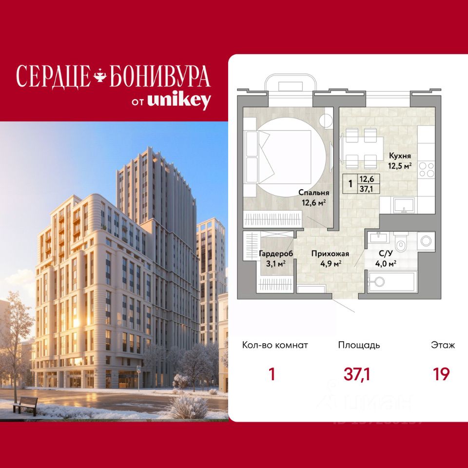 1-комн. квартира в ЖК "Сердце Бонивура" на 19 этаже. Квартира без отделки, полностью готова к ремонту. Общая площадь: 37.1 кв.м., жилая: 12.5 кв.м., площадь просторной кухни-столовой: 12.7 кв.м. Все окна выходят на одну сторону. В квартире один совмещенный санузел. Высота потолков 2.85 м.