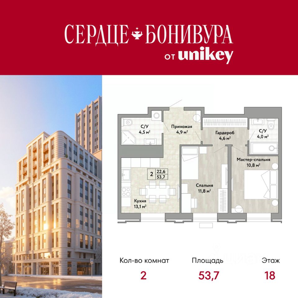 Продается 2-комн. квартира в ЖК "Сердце Бонивура" на 18 этаже. Общая площадь: 53.7 кв.м. Высота потолков 2.85 м.