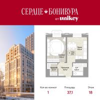 1-комн. квартира в ЖК "Сердце Бонивура" на 18 этаже. Квартира без отделки, после оформления собственности можно делать ремонт. Общая площадь: 37.1 кв.м., жилая: 12.5 кв.м., площадь просторной кухни-столовой: 12.7 кв.м. Все окна выходят на одну сторону. В квартире один совмещенный санузел. Высота потолков 2.85 м.