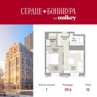 Просторная однокомнатная квартира в ЖК "Сердце Бонивура" на 15 этаже. Общая площадь: 39.4 кв.м. Высота потолков 2.85 м.