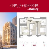 Просторная 2-комн. квартира в ЖК "Сердце Бонивура" на 12 этаже. Общая площадь: 53.7 кв.м. Высота потолков 2.85 м.