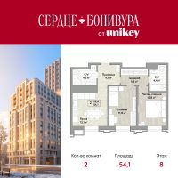 Двухкомнатная квартира в ЖК "Сердце Бонивура" на 8 этаже. Общая площадь: 54.1 кв.м. Высота потолков 2.85 м.