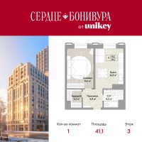 Продается однокомнатная квартира от застройщика в ЖК "Сердце Бонивура" на 3 этаже. Общая площадь: 41.1 кв.м. Высота потолков 2.85 м.