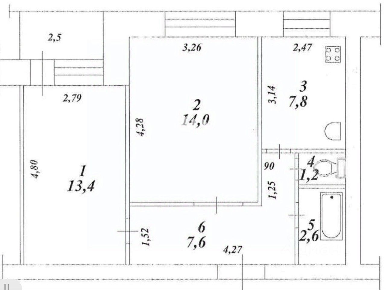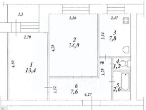 Предлагаем к продаже двухкомнатную квартиру общей площадью 46,6 кв. м, расположенную на седьмом этаже девятиэтажного кирпичного дома 1986 года постройки. Квартира имеет раздельные комнаты (14,0 + 13,4 кв. м), кухню площадью 7,8 кв. м и раздельный санузел. Высота потолков — 2,5 м.