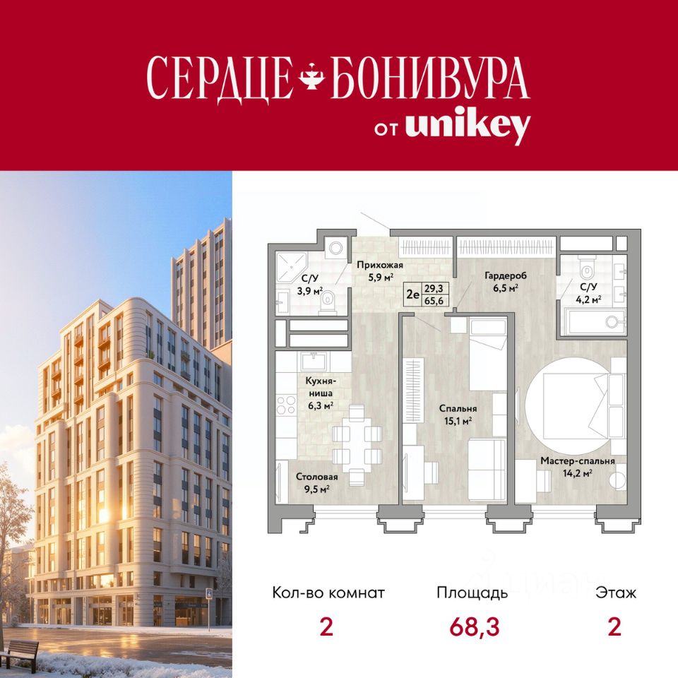 Просторная двухкомнатная квартира в ЖК "Сердце Бонивура" на 2 этаже. Квартира без отделки, новый владелец может сделать ремонт по своему проекту. Общая площадь: 68.3 кв.м., жилая: 29.4 кв.м., площадь просторной кухни-столовой: 16.4 кв.м. Комнаты изолированные, все окна выходят на одну сторону. В квартире два совмещенных санузла. Высота потолков 2.85 м.