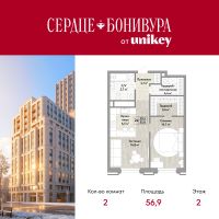2-комн. квартира с европланировкой от застройщика в ЖК "Сердце Бонивура" на 2 этаже. Квартира без отделки, после выдачи ключей можно делать ремонт. Общая площадь: 56.9 кв.м., жилая: 30.5 кв.м., общая площадь гостиной-столовой с кухонной зоной: 23.4 кв.м. Европланировка, кухня и гостиная объединены в одно просторное помещение. Комнаты изолированные, все окна выходят на одну сторону. В квартире один совмещенный санузел. Высота потолков 2.85 м.