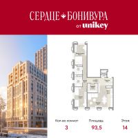 Трехкомнатная квартира с европланировкой в ЖК "Сердце Бонивура" на 14 этаже. Квартира без отделки, новый владелец может сделать ремонт по индивидуальному дизайн-проекту. Общая площадь: 93.5 кв.м., жилая: 56.2 кв.м., общая площадь гостиной-столовой с кухонной зоной: 28.6 кв.м. Европейская планировка, за счет большой площади кухни-гостиной квартира выглядит просторной и очень удобна для жизни. Квартира без проходных комнат, окна выходят нa три cтopoны дома. В квартире два совмещенных санузла. Высота потолков 2.85 м.