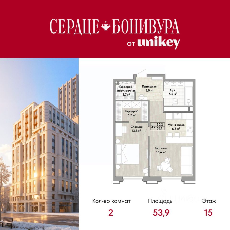 Просторная 2-комн. квартира с европланировкой в ЖК "Сердце Бонивура" на 15 этаже. Квартира без отделки, после оформления собственности можно делать ремонт. Общая площадь: 53.9 кв.м., жилая: 30.2 кв.м., общая площадь гостиной-столовой с кухонной зоной: 22.9 кв.м. Европланировка, кухня-гостиная - идеальный вариант для тех, кто любит часто принимать гостей. Комнаты изолированные, все окна выходят на одну сторону. В квартире один совмещенный санузел. Высота потолков 2.85 м.