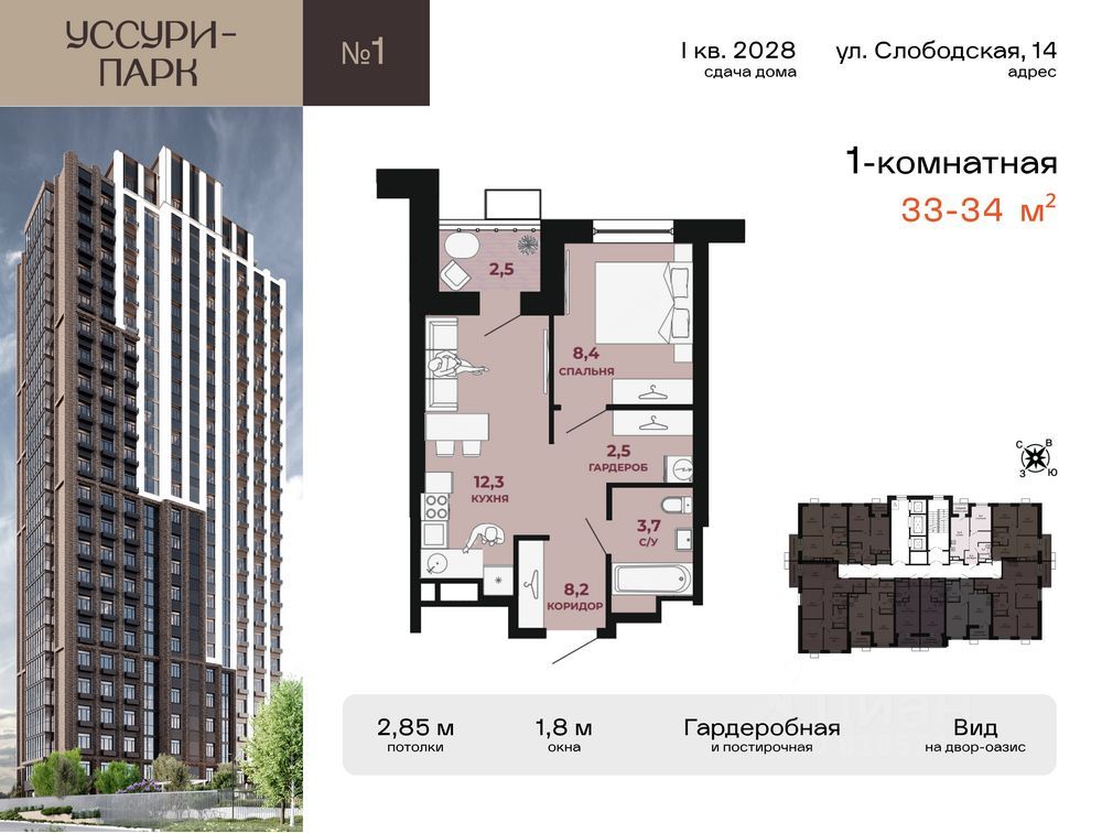 Высокие потолки 2,85 - 3,30 м от стяжки пола, большие окна до 1,8 м и панорамные виды на двор-сад с лоджии - все это дает максимум света, легкости и свободного пространства.