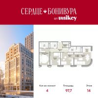 Продается 4-комн. квартира в ЖК "Сердце Бонивура" на 14 этаже. Общая площадь: 97.7 кв.м. Высота потолков 2.85 м.