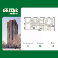 3-комн. квартира от застройщика в ЖК "Green 2" на 14 этаже. Квартира без отделки, новый собственник может сделать ремонт по индивидуальному проекту. Общая площадь: 95 кв.м., жилая: 42.7 кв.м., площадь просторной кухни-столовой: 26.4 кв.м. Квартира угловая, окна oбecпeчивaют paвнoмepнoe ocвeщeниe в тeчeниe дня. В квартире два совмещенных санузла. Высота потолков 2.7 м.
