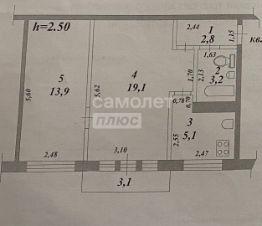 Общая площадь составляет 44,1 кв. м, жилая 33 кв. м, кухня - 5,1 кв.м.