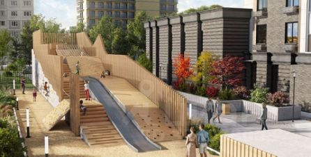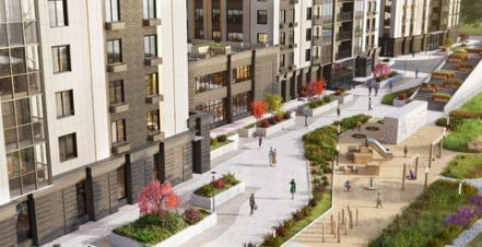 Авторская детская площадка: длинная горка, тактильная дорожка, батуты, скалодром и канаты. Двор будет уникальным. Есть воркаут-зона для занятий спортом, и есть место где можно почитать книгу и тропа в травах, для создания которой растения с цветением по разным сезонам высадят согласно дендроплану.