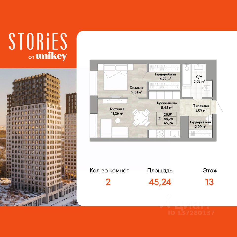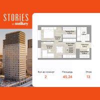 Продается двухкомнатная квартира с европланировкой и предчистовой отделкой в ЖК "Stories" на 13 этаже. Общая площадь: 45.24 кв.м., жилая: 20.91 кв.м., общая площадь гостиной-столовой с кухонной зоной: 19.75 кв.м. Европланировка, кухня и гостиная объединены в одно просторное помещение. Комнаты изолированные, все окна выходят на одну сторону. В квартире один совмещенный санузел. Высота потолков 2.9 м.