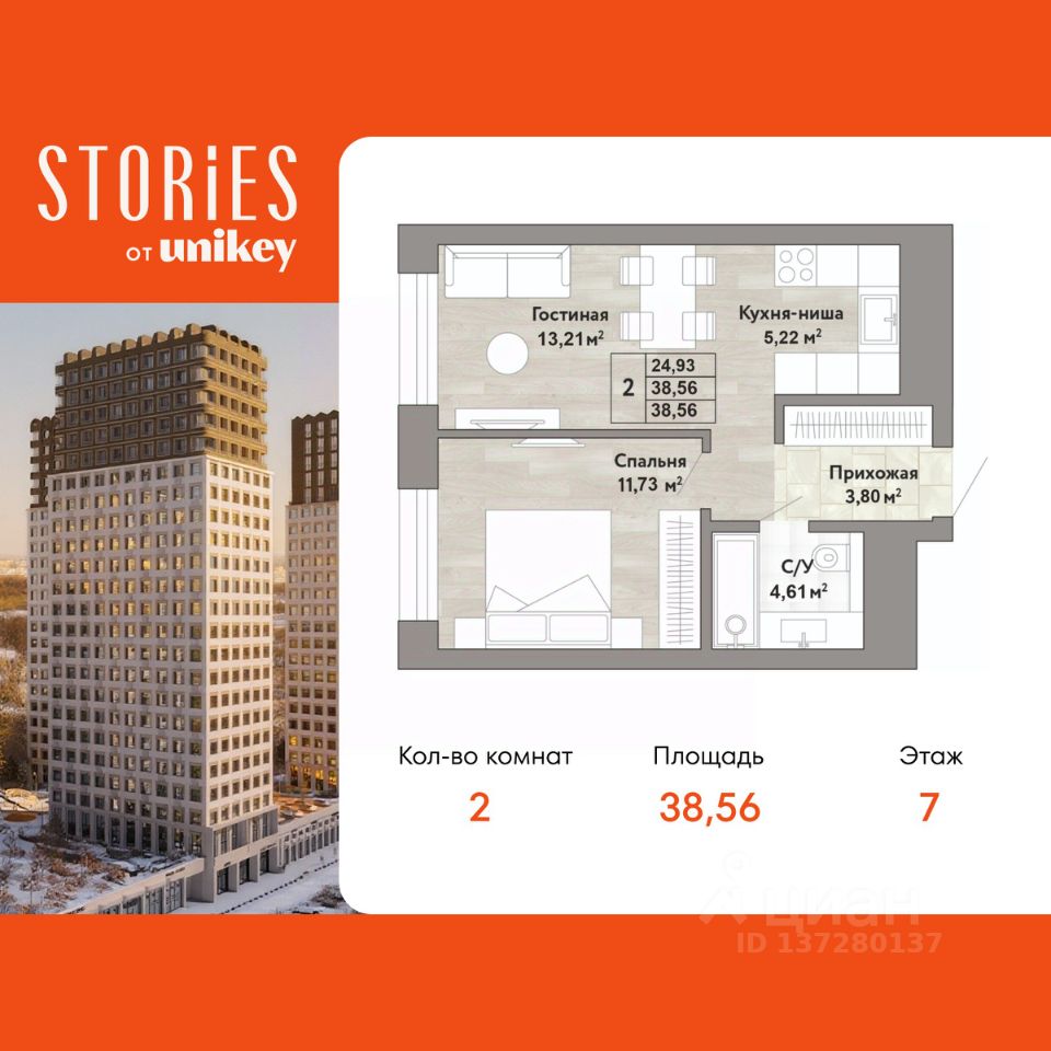 Продается 2-комн. квартира с европланировкой в ЖК "Stories" на 7 этаже. Квартира без отделки, полностью готова к чистовой отделке и дальнейшему ремонту. Общая площадь: 38.56 кв.м., жилая: 24.94 кв.м., общая площадь гостиной-столовой с кухонной зоной: 18.43 кв.м. Европейская планировка, кухня и гостиная объединены в одно просторное помещение. Комнаты изолированные, все окна выходят на одну сторону. В квартире один совмещенный санузел. Высота потолков 2.9 м.