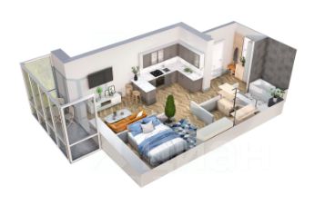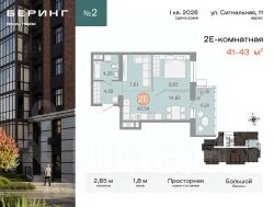 Светлая и комфортная евродвушка 42 м². Здесь спальня, просторная кухня-гостиная, санузел и балкон с панорамным видом, который можно оборудовать как зону отдыха или рабочее место.