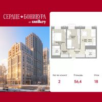 2-комн. квартира в ЖК "Сердце Бонивура" на 18 этаже. Квартира без отделки, после оформления собственности можно делать ремонт. Общая площадь: 56.4 кв.м., жилая: 25 кв.м., площадь просторной кухни-столовой: 13.5 кв.м. Комнаты изолированные, все окна выходят на одну сторону. В квартире два совмещенных санузла. Высота потолков 2.85 м.