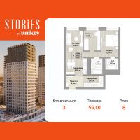 Трехкомнатная квартира с европланировкой и предчистовой отделкой в ЖК "Stories" на 8 этаже. Общая площадь: 59.01 кв.м., жилая: 32.44 кв.м., суммарная площадь гостиной-столовой с кухонной зоной: 21.48 кв.м. Европейская планировка, зона гостиной комнаты объединена с кухней. Комнаты изолированные, все окна выходят на одну сторону. В квартире два совмещенных санузла. Высота потолков 2.9 м.
