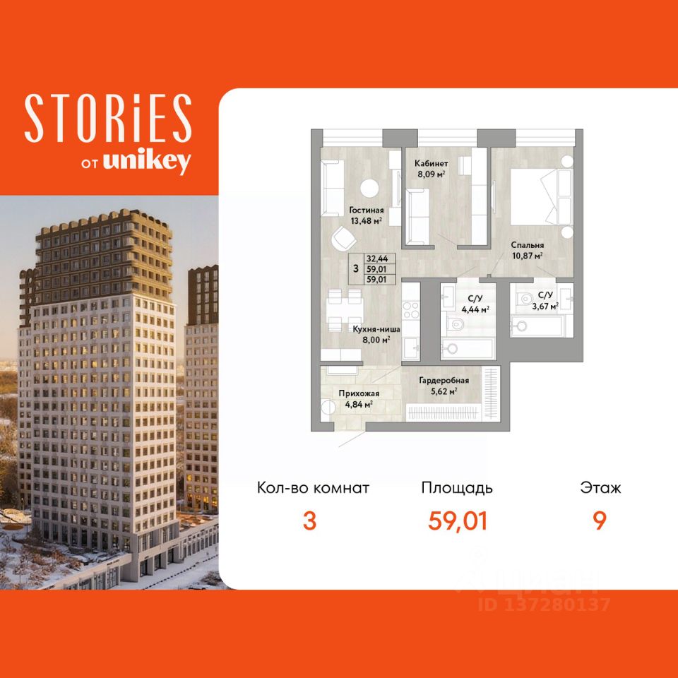 Трехкомнатная квартира с европланировкой и предчистовой отделкой в ЖК "Stories" на 9 этаже. Общая площадь: 59.01 кв.м., жилая: 32.44 кв.м., суммарная площадь гостиной-столовой с кухонной зоной: 21.48 кв.м. Европейская планировка, кухня-гостиная - идеальный вариант для тех, кто любит часто принимать гостей. Комнаты изолированные, все окна выходят на одну сторону. В квартире два совмещенных санузла. Высота потолков 2.9 м.