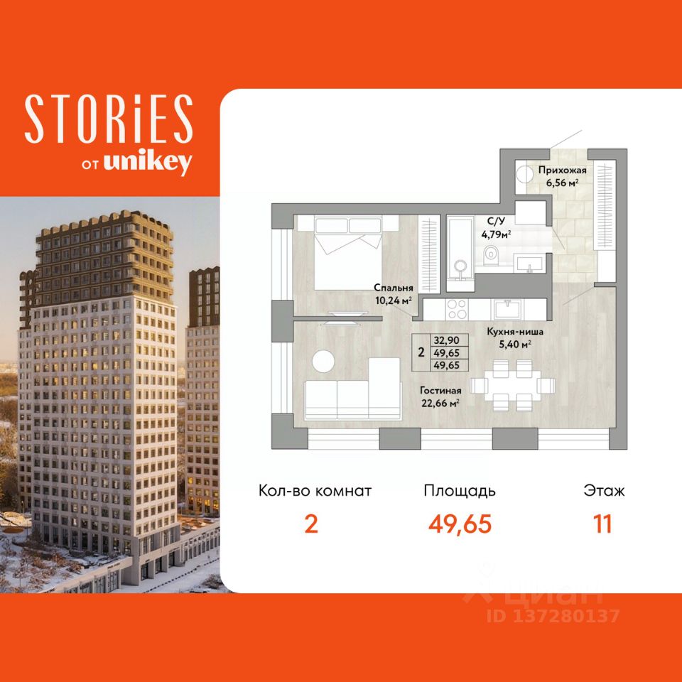 Двухкомнатная квартира с европланировкой и предчистовой отделкой в ЖК "Stories" на 11 этаже. Общая площадь: 49.65 кв.м., жилая: 32.9 кв.м., общая площадь гостиной-столовой с кухонной зоной: 28.06 кв.м. Европланировка, кухня и гостиная объединены в одно просторное помещение. Угловая квартира, очень светлая, естественная вентиляция при открытии окон. В квартире один совмещенный санузел. Высота потолков 2.9 м.