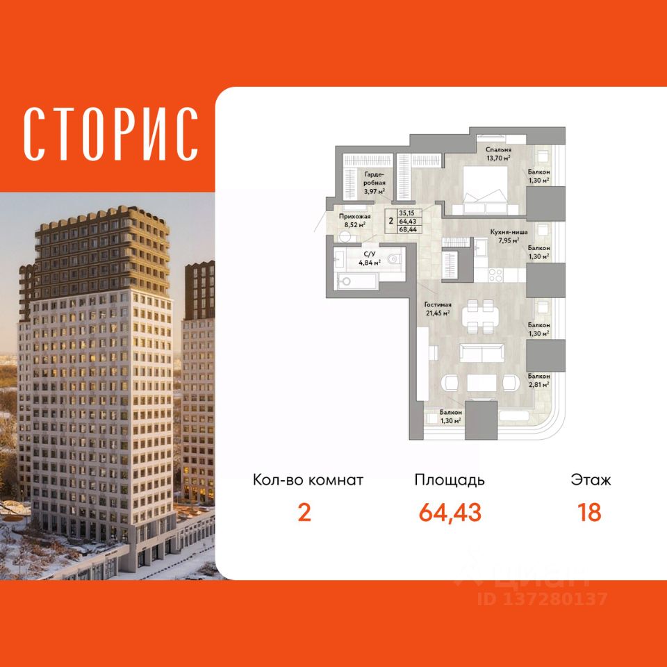 Продается 2-комн. квартира с европланировкой в ЖК "Сторис" на 18 этаже. Квартира без отделки, новый владелец может сделать ремонт по своему дизайн-проекту. Общая площадь: 64.43 кв.м., жилая: 35.15 кв.м., общая площадь гостиной-столовой с кухонной зоной: 29.4 кв.м. Европейская планировка, зона гостиной комнаты объединена с кухней. Квартира угловая, очень светлая, естественная вентиляция при открытии окон. В квартире один совмещенный санузел. Высота потолков 2.9 м.