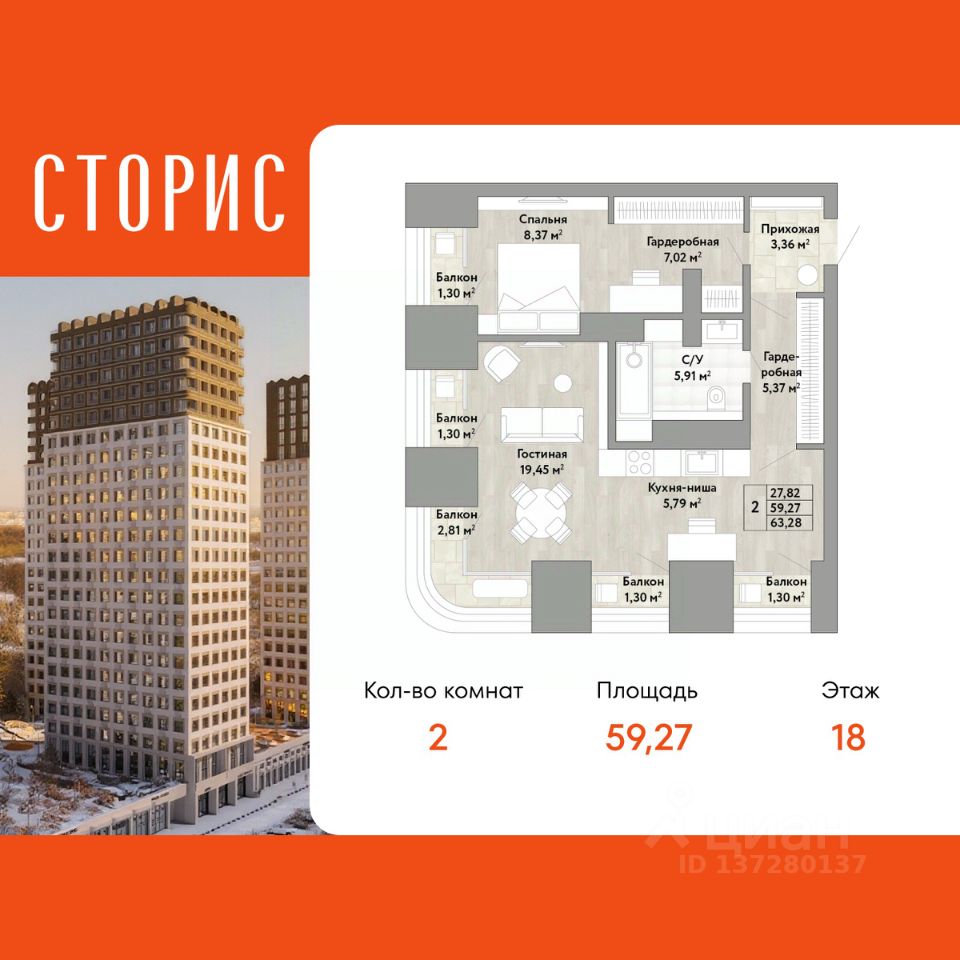 Просторная 2-комн. квартира с европланировкой в ЖК "Сторис" на 18 этаже. Квартира без отделки, после выдачи ключей можно делать ремонт. Общая площадь: 59.27 кв.м., жилая: 27.82 кв.м., общая площадь гостиной-столовой с кухонной зоной: 25.24 кв.м. Европланировка, в просторной кухне-гостиной удобно как готовить, так и отдыхать. Угловая квартира, очень светлая, естественная вентиляция при открытии окон. В квартире три балкона, один совмещенный санузел. Высота потолков 2.9 м.