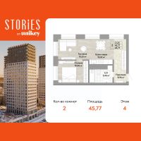 Продается 2-комн. квартира с европланировкой и предчистовой отделкой в ЖК "Stories" на 4 этаже. Общая площадь: 45.77 кв.м., жилая: 21.35 кв.м., общая площадь гостиной-столовой с кухонной зоной: 20.55 кв.м. Европейская планировка, зона гостиной комнаты объединена с кухней. Угловая квартира, очень светлая, естественная вентиляция при открытии окон. В квартире один совмещенный санузел. Высота потолков 2.9 м.