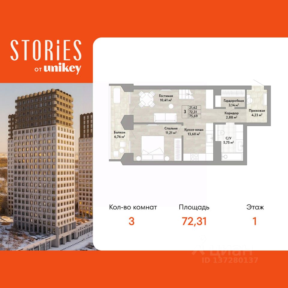 Трехкомнатная квартира с европланировкой и предчистовой отделкой в ЖК "Stories" на 1 этаже. Общая площадь: 72.31 кв.м., жилая: 21.62 кв.м., суммарная площадь гостиной-столовой с кухонной зоной: 24.01 кв.м. Европейская планировка, зона гостиной комнаты объединена с кухней. Комнаты изолированные, все окна выходят на одну сторону. В квартире один балкон, один совмещенный санузел. Высота потолков 2.9 м.