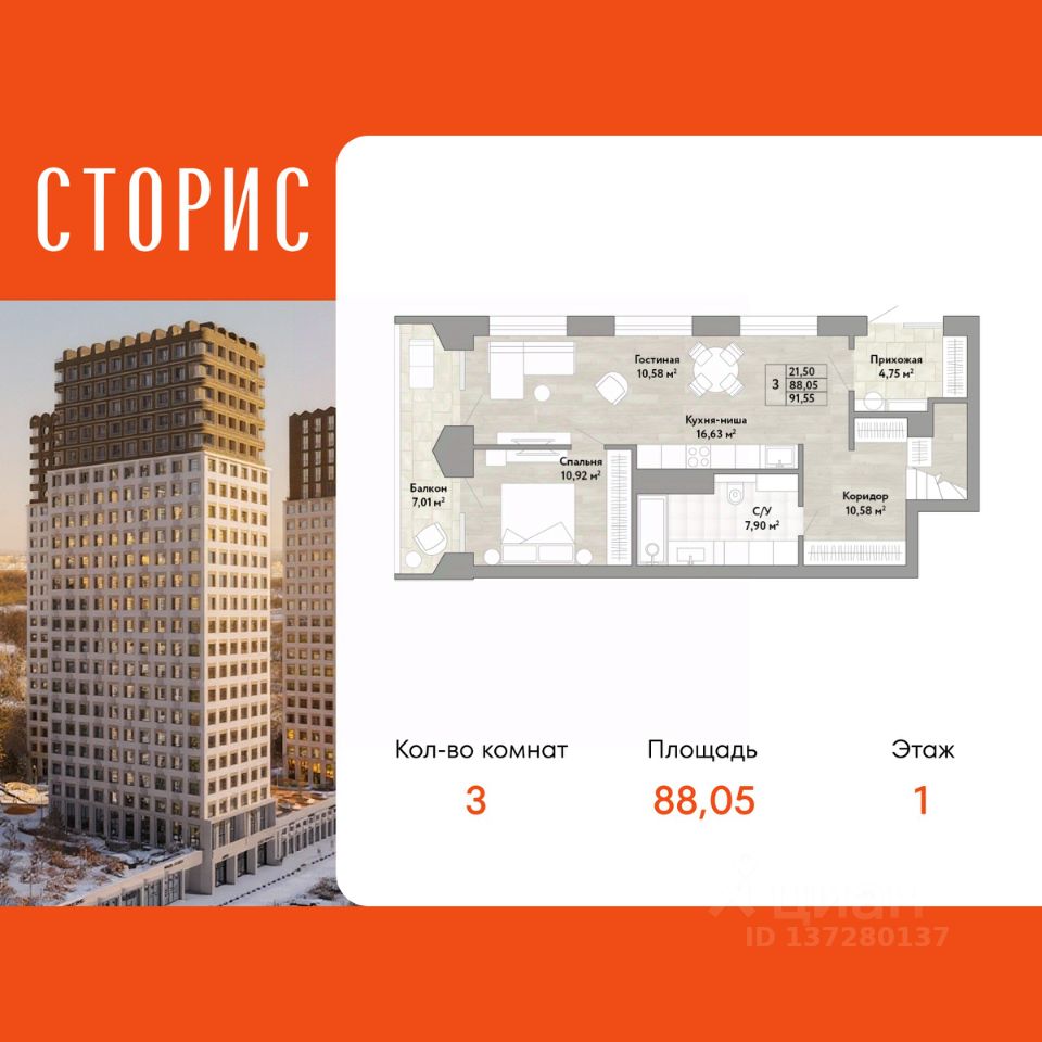 3-комн. квартира с европланировкой в ЖК "Сторис" на 1 этаже. Квартира без отделки, новый владелец может сделать ремонт по индивидуальному проекту. Общая площадь: 88.05 кв.м., жилая: 31.5 кв.м., общая площадь гостиной-столовой с кухонной зоной: 27.21 кв.м. Европейская планировка, кухня-гостиная - идеальный вариант для тех, кто любит часто принимать гостей. Квартира угловая, идеально подойдет любителям тишины и панорамных видов. В квартире один балкон, один совмещенный санузел. Высота потолков 2.9 м.