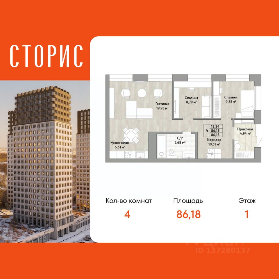 Четырехкомнатная квартира с европланировкой от застройщика в ЖК "Сторис" на 1 этаже. Квартира без отделки, новый собственник может сделать ремонт по индивидуальному дизайн-проекту. Общая площадь: 86.18 кв.м., жилая: 48.29 кв.м., общая площадь гостиной-столовой с кухонной зоной: 26.56 кв.м. Европланировка, кухня-гостиная - идеальный вариант для тех, кто любит часто принимать гостей. Угловая квартира, очень светлая, естественная вентиляция при открытии окон. В квартире один совмещенный санузел. Высота потолков 2.9 м.