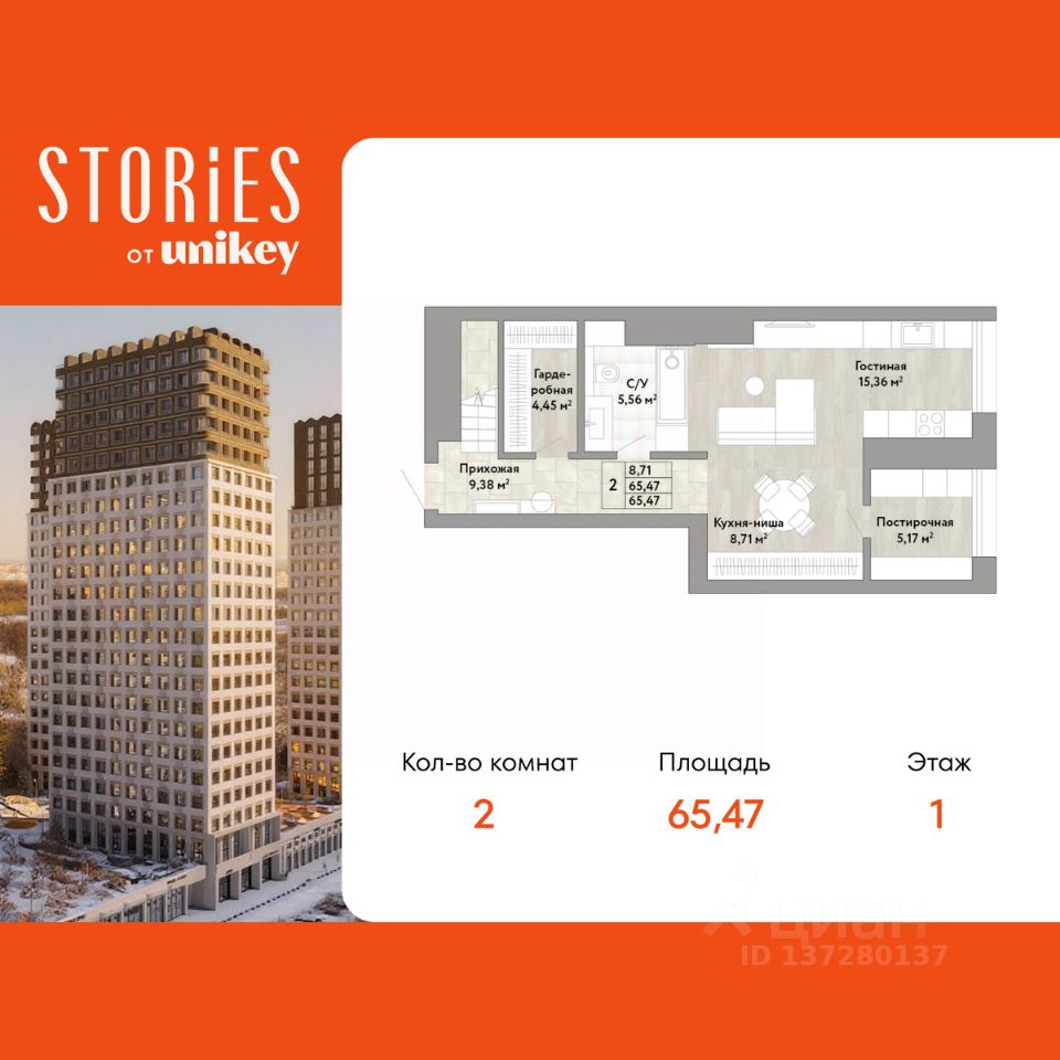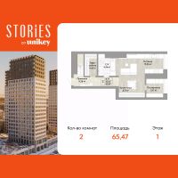 Двухкомнатная квартира с европланировкой и предчистовой отделкой в ЖК "Stories" на 1 этаже. Общая площадь: 65.47 кв.м., жилая: 30.36 кв.м., суммарная площадь гостиной-столовой с кухонной зоной: 24.07 кв.м. Европланировка, зона гостиной комнаты объединена с кухней. Комнаты изолированные, все окна выходят на одну сторону. В квартире один совмещенный санузел. Высота потолков 2.9 м.