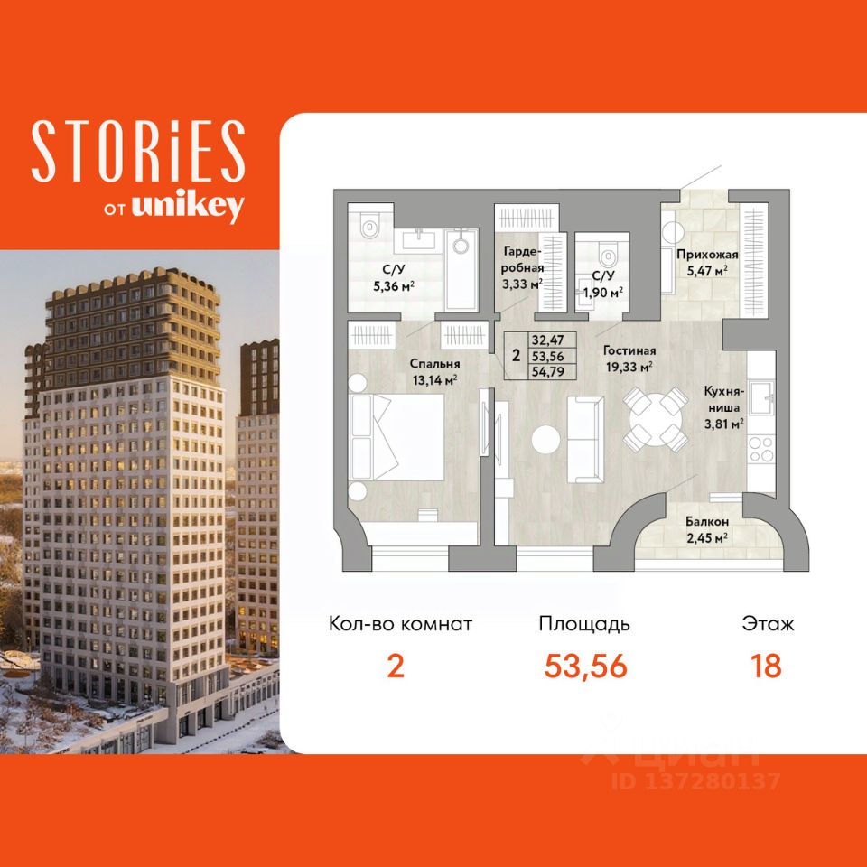 Двухкомнатная квартира с европланировкой и предчистовой отделкой в ЖК "Stories" на 18 этаже. Общая площадь: 53.56 кв.м., жилая: 32.47 кв.м., общая площадь гостиной-столовой с кухонной зоной: 23.14 кв.м. Европейская планировка, в просторной кухне-гостиной удобно как готовить, так и отдыхать. Комнаты изолированные, все окна выходят на одну сторону. В квартире одна лоджия, один совмещенный и один раздельный санузел. Высота потолков 2.9 м.