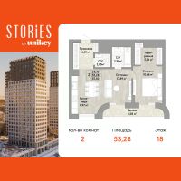 Продается 2-комн. квартира с европланировкой и предчистовой отделкой в ЖК "Stories" на 18 этаже. Общая площадь: 53.28 кв.м., жилая: 28.55 кв.м., суммарная площадь гостиной-столовой с кухонной зоной: 22.86 кв.м. Европейская планировка, за счет большой площади кухни-гостиной квартира выглядит просторной и очень удобна для жизни. Комнаты изолированные, все окна выходят на одну сторону. В квартире одна лоджия, один раздельный санузел. Высота потолков 2.9 м.